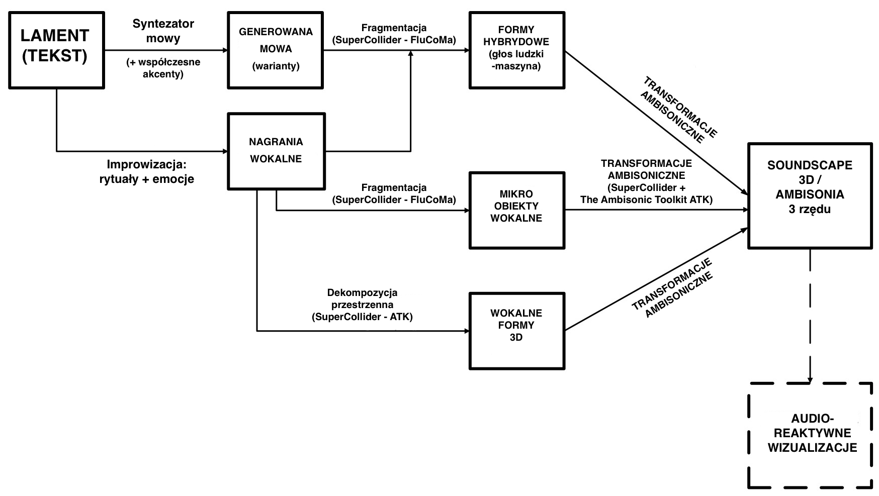 Powyższy materiał dźwiękowy, wyprowadzony bezpośrednio z tekstu Lamentu, został skomponowany w trójwymiarowy obraz dźwiękowy, zrealizowany w ambisonii 3 rzędu: