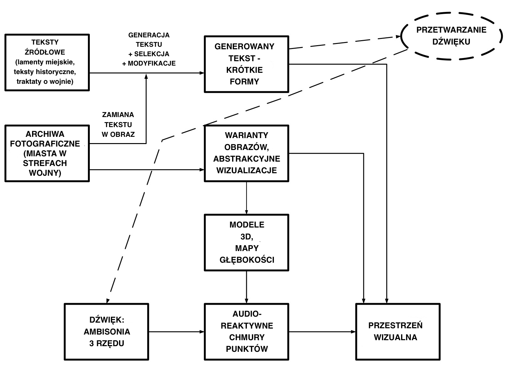 2) ETAP 2 - generacja tekstu, hybrydyzacja źródłowego materiału za pomocą uczenia maszynowego oraz transformacji przestrzennych. Rezultat: hybrydowe krótkie formy dźwiękowe, formy przejściowe pomiędzy głosem ludzkim a maszynowym.